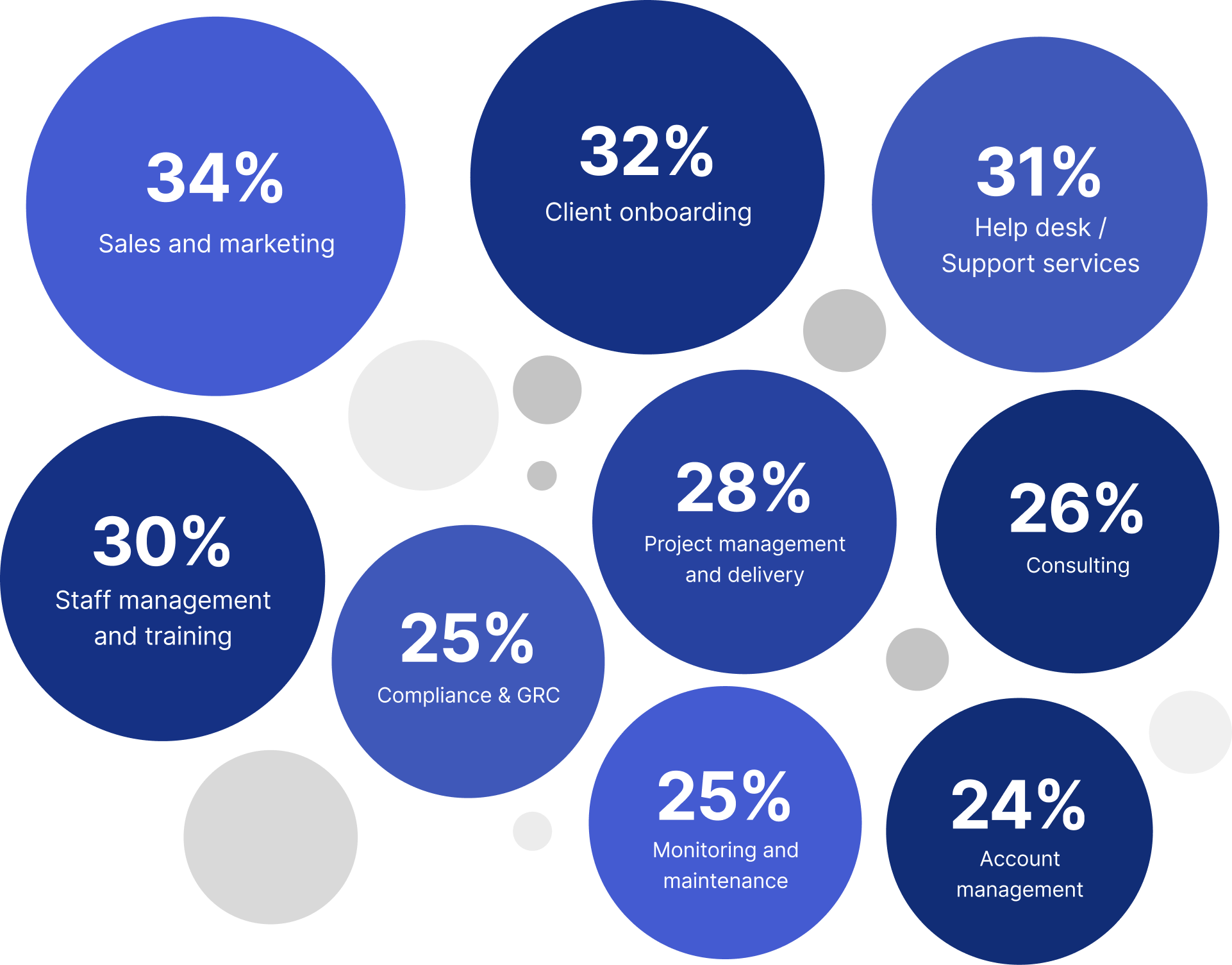 There’s only a 10% difference between responses on the least efficient areas of MSPs’ businesses, meaning challenges are varied across providers, and no single function is a universal bottleneck.