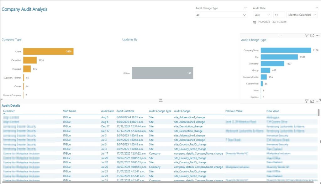 The example we have above shows updates made to Site and Company records by their documentation tool, ITGlue.