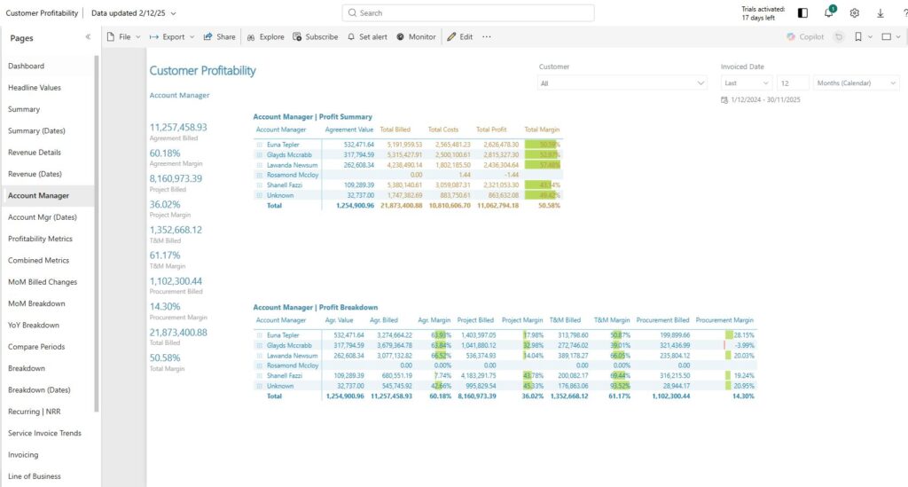 Technical Account Manager has been added as a filter just below Account Manager on the Summary page of the Customer Profitability Report. If your organization has both AMs and TAMs, with different customer responsibilities or lines of reporting, this will allow you to see how profitable each TAM’s portfolio of accounts is by month.