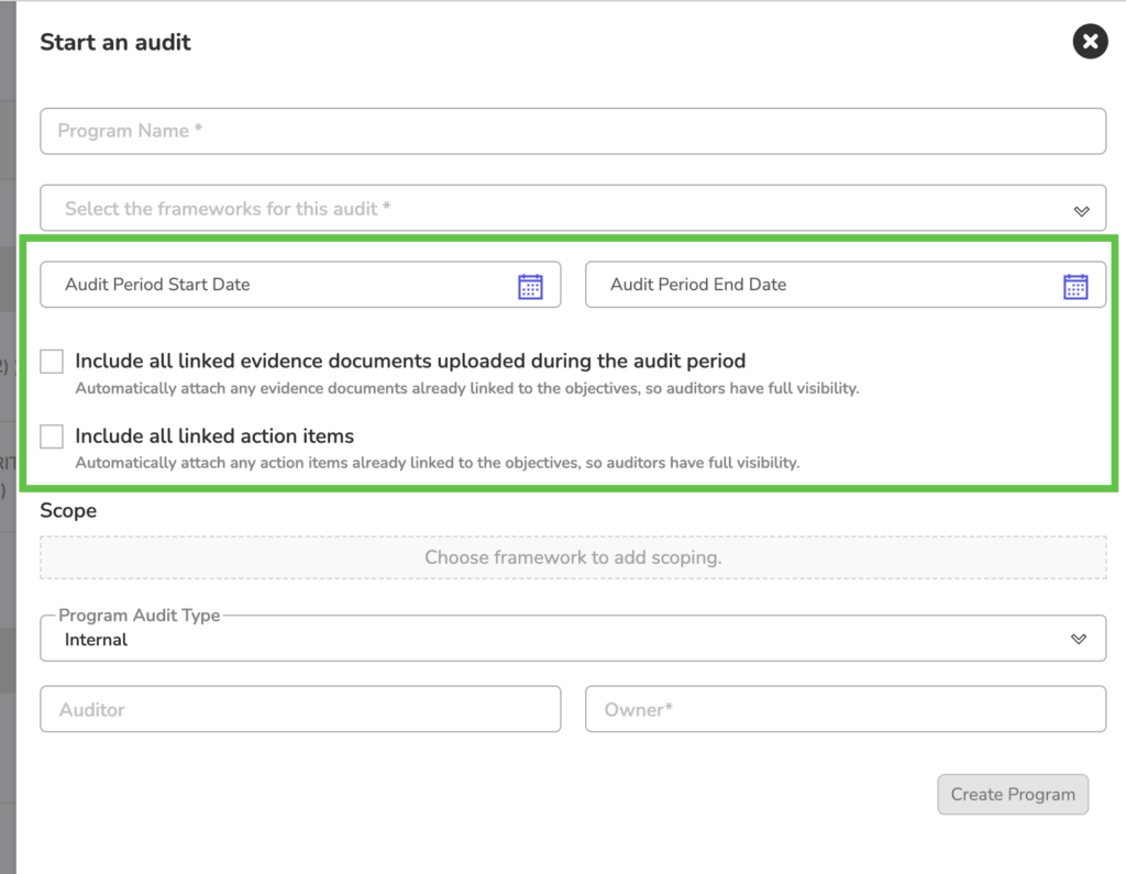 • Scoped Requirements: Choose whether to include all in-scope requirements or select specific ones when creating an audit program.