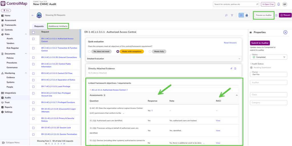 CMMC assessors don’t score the top-level objectives. They score the sub-objectives. ControlMap has supported this workflow for years, making it a popular choice in the CMMC community. That unique sub-objective workflow has been added to the audit feature set.