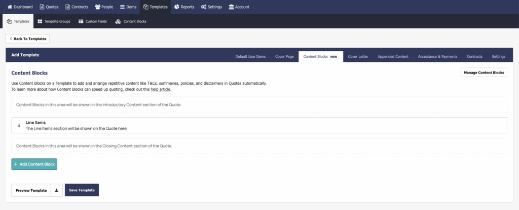Content Blocks are live now and can be created, deleted, and updated by Quoter users with Product Manager permissions or higher. Head to the Templates section of your account to start creating your first reusable blocks and see how much faster and easier building quotes can be.