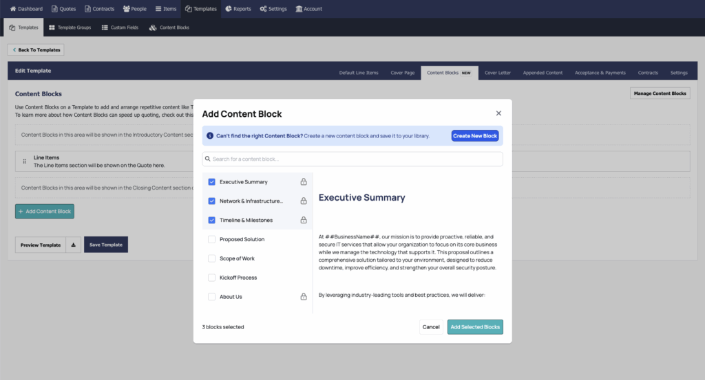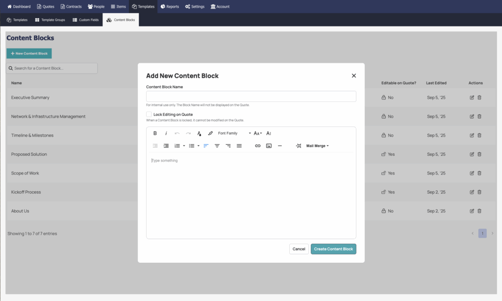 Need boilerplate text or a product description in a specific quote, but not every quote from a template? You can add content blocks directly to a quote, or even create a new block right from the Quote Editor if you have the right user permissions.