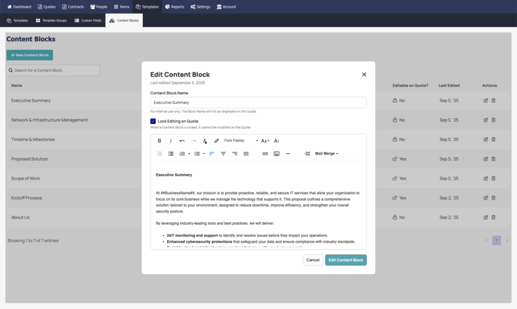 We know that content evolves — promotions change, terms get updated, and messaging shifts. Content Blocks keep your team in sync while allowing you to make changes across all templates and quotes that use those specific Blocks: