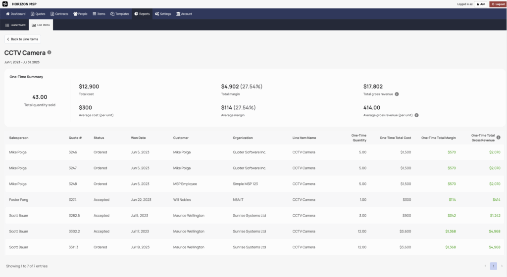 You can see which Salespeople are selling the CCTV camera item, how many they’re selling on each deal, and the revenue/cost/margin associated with each Won quote. You can also see every quote this item exists on.