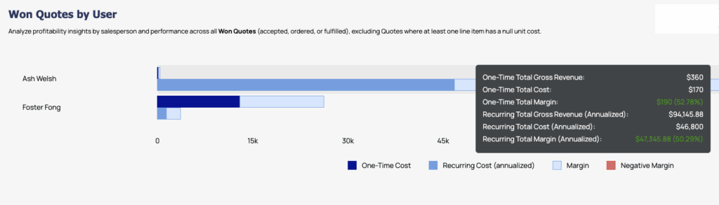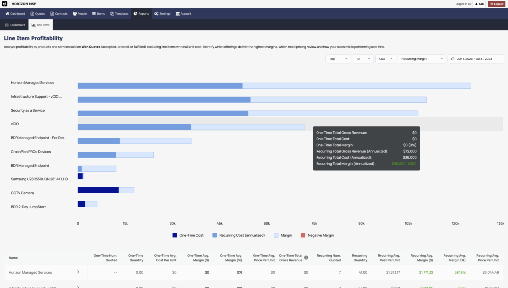 Note the details are split into one-time and recurring, with the number of quotes, quantity quoted, and calculated average margins. Note that we dynamically hide the recurring or one-time elements if they are empty, so you only see what you need to see.