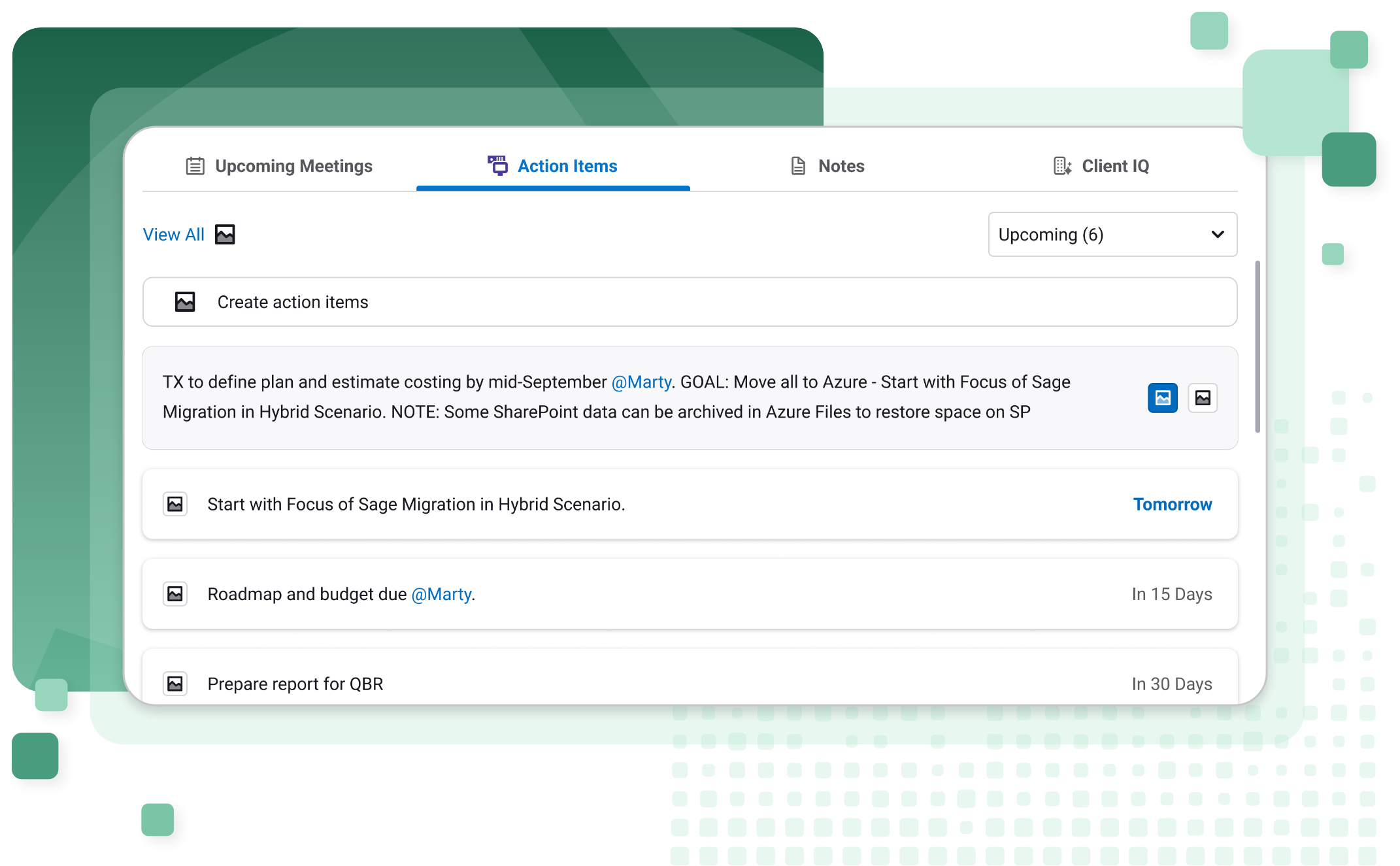 Capture client notes and follow-ups in one place, with PSA integration for accountability and tracking.