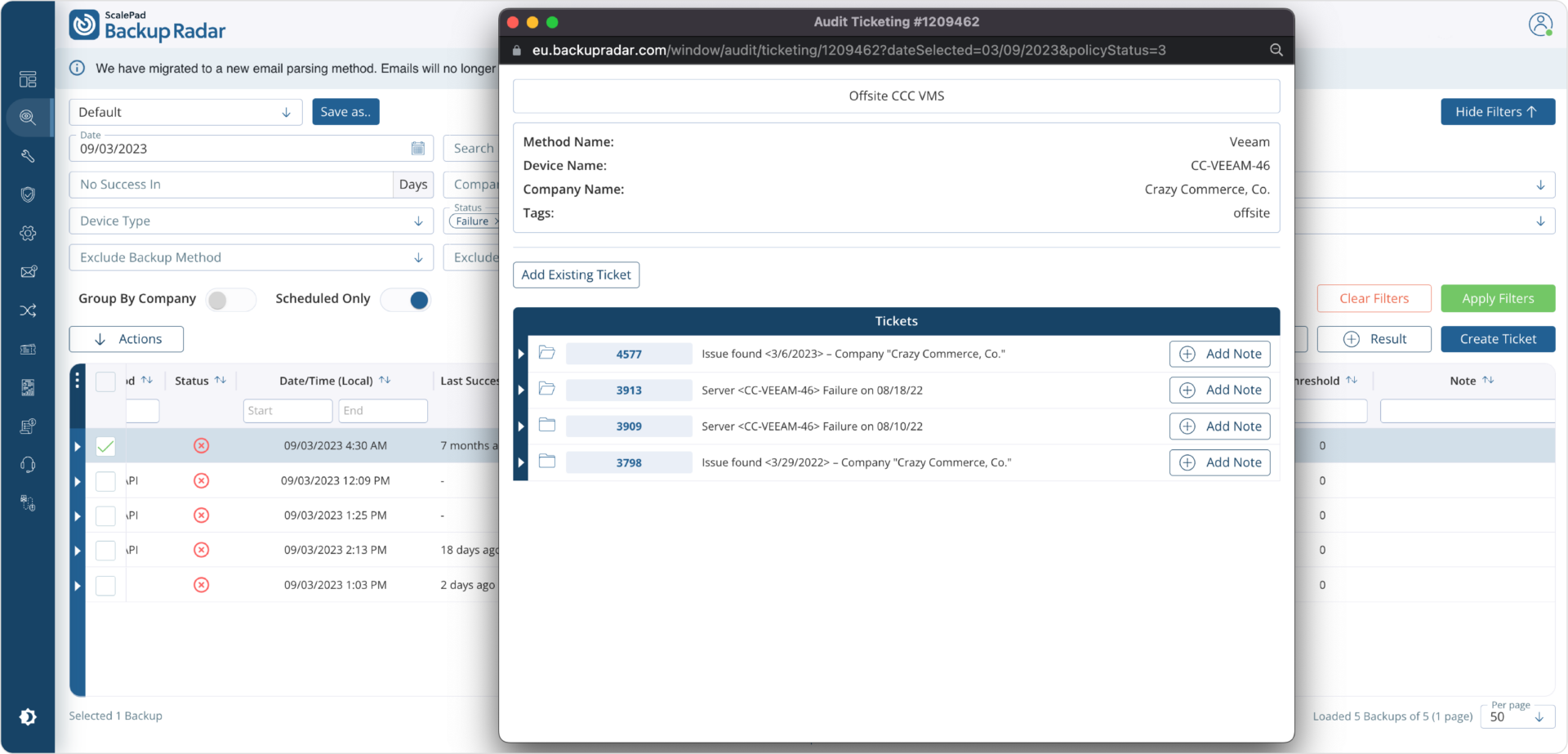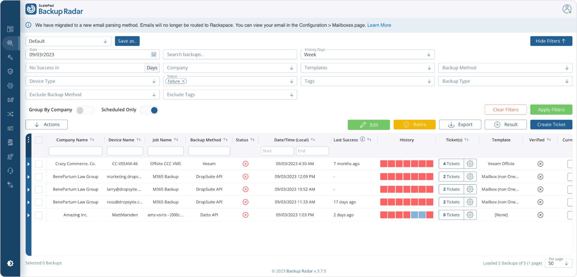 Forward all your backup alerts to your Backup Radar alert mailbox. From here, intelligent ticketing will automatically parse, append, and close tickets as necessary. This can be set up so you only see exactly what you need to see.